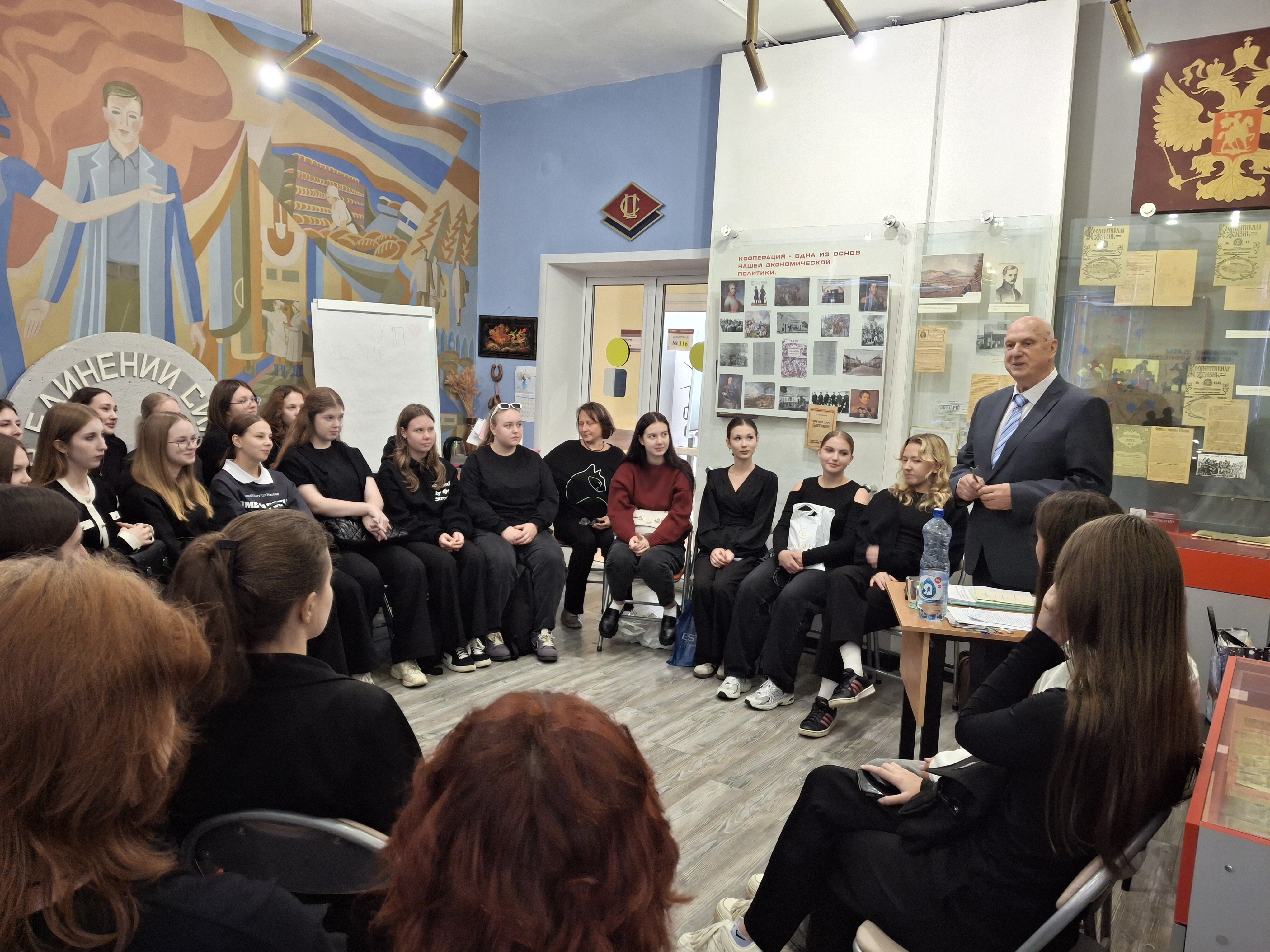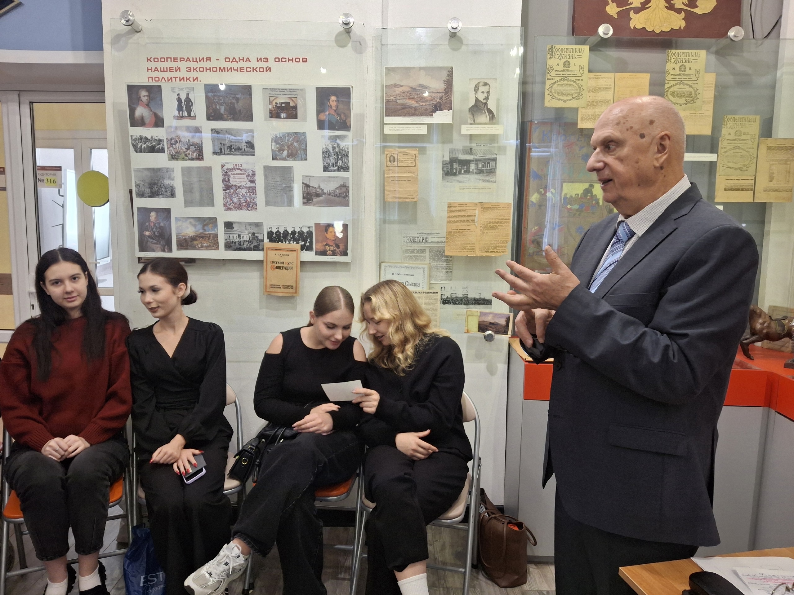 Студенты 2 курса в рамках занятий по изучению истории потребительской кооперации встретились с Николаем Ивановичем Чукиным — экс-преподавателем ВТЭП и кооперативного вуза, 28 лет возглавлявшим Владкоопсоюз. Николай Чукин рассказал молодежи о своих студенческих годах обучения, о преподавании во Владимирском филиале. Легенда владимирской кооперации настаивал, на том, что участие молодых кадров в кооперативном движении необходимо.